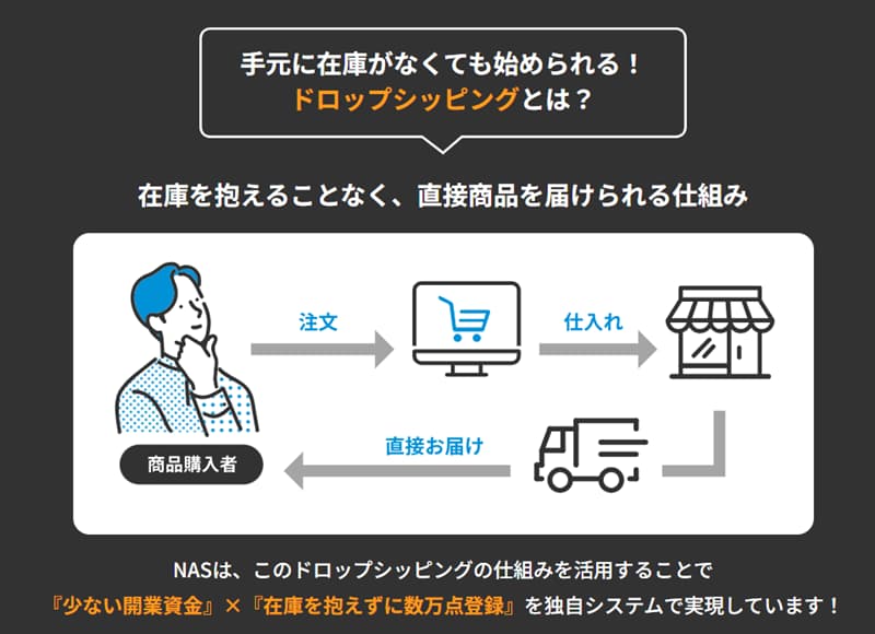 一般的な物販では在庫を抱えることが基本ですが、アドロジのNASシステムではドロップシッピングの仕組みを採用しています。