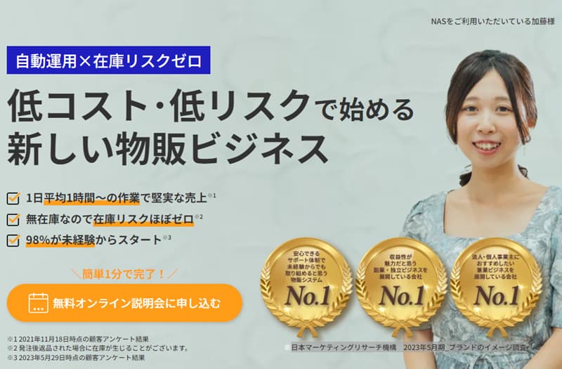 NASシステムの説明会申し込みページの冒頭には「低コスト・低リスクで始められる」と書かれています。