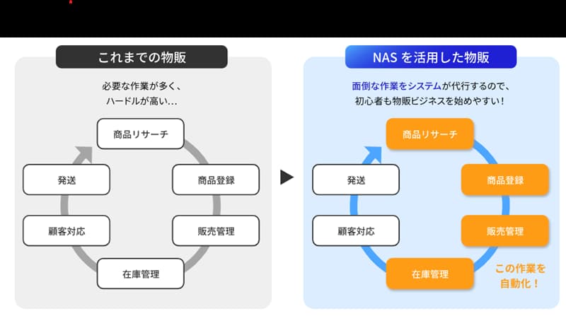 しかし、このNASシステムがあれば、商品リサーチや登録、販売管理、在庫管理までを自動化することができます。