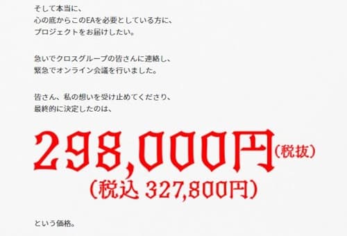 さらにFX商材の老舗であるクロスリテイリング株式会社のプロデュース費用もかかっていて、プラスで講義やサポート費用などのコストもかかっています。