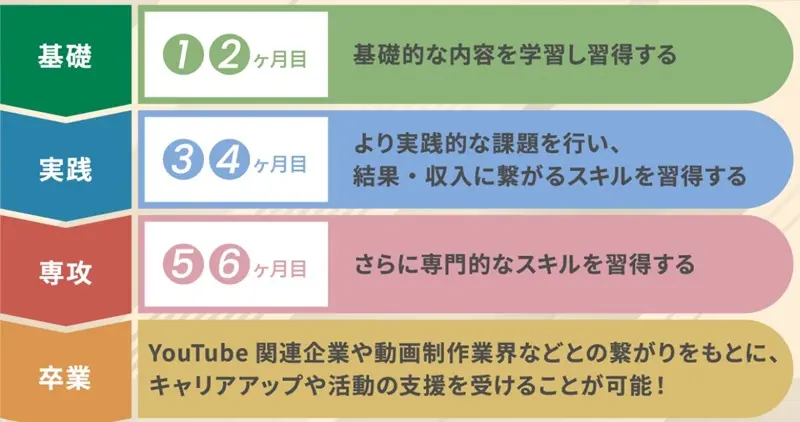 6ヶ月の間に動画制作に関連するスキルをトータル的に身に付けていくカリキュラムですね。