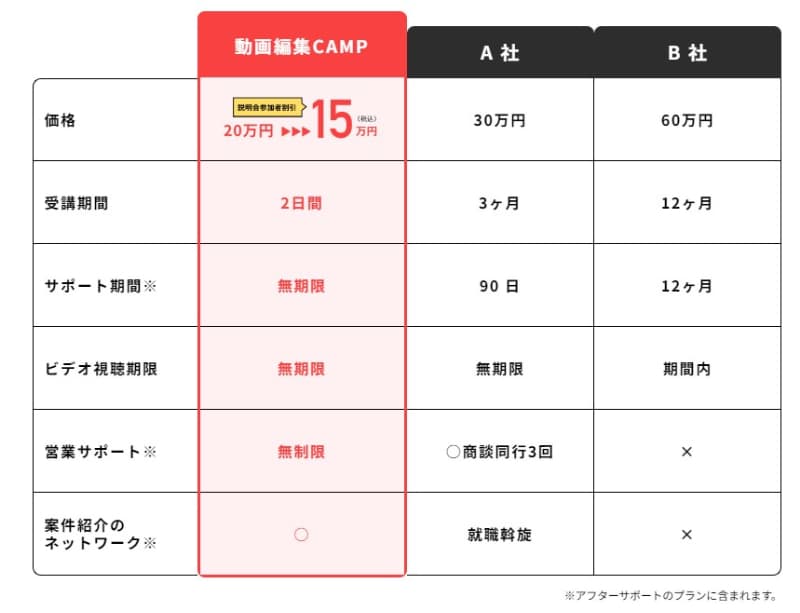 動画編集スキルのみを身に付けたいなら動画編集CAMPのみ、案件獲得までいきたいならアフターサポートプランといったところになります。