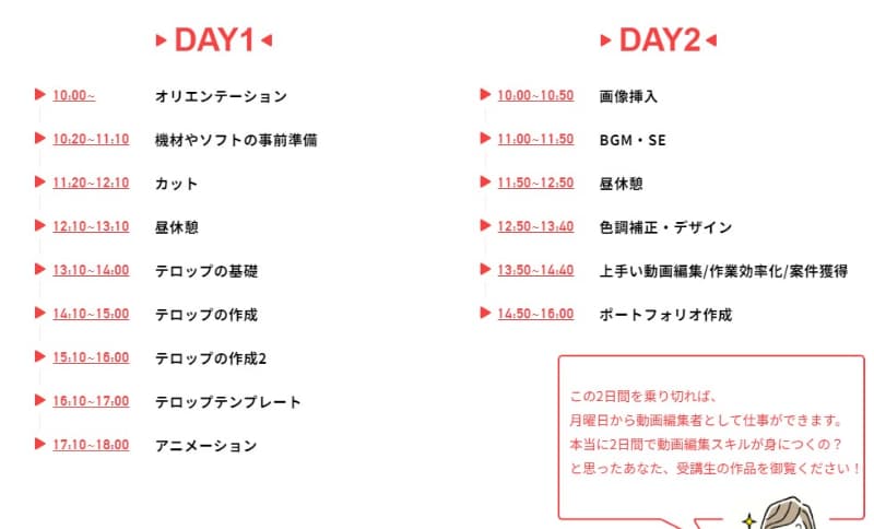 動画編集CAMPは前述の通り、“土日の2日間でYouTube動画編集のスキルが身に付く”というコンセプトになっています。