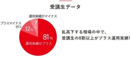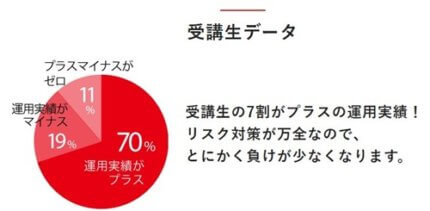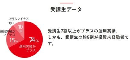 受講データとしては、受講者の7割がプラスの運用実績で、受講者の8割は投資未経験者ということです。