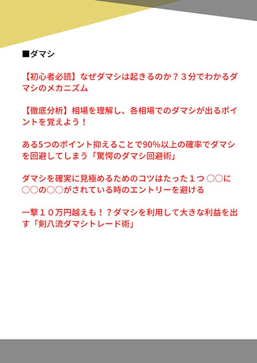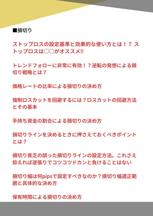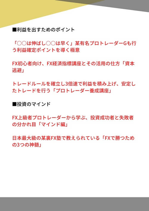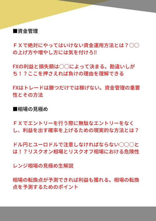 先ほど負けないための運用方法として挙げたように、自動売買では「ダマシ」や「損切り」に注意しなければならないので、その2つを中心とした特典に加え、資金管理や利益を出すためのポイントなどもまとめています。