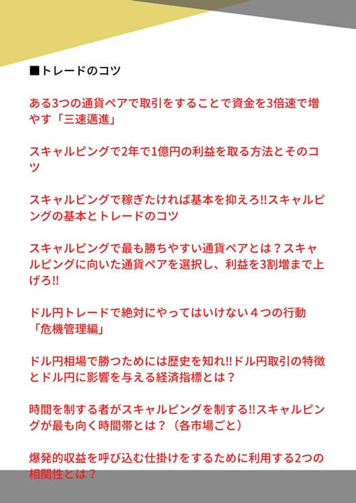 その他にも投資資金を増やす方法やFXで利益を出すために必要な情報も用意しましたので、「SPIDER」を稼働させて稼ぎつつ、時間ができれば活用して頂ければと思います。