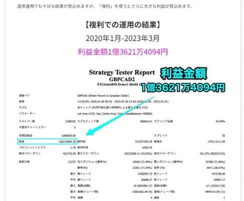 実際に販売ページでも、複利なしでの運用結果は約463万円なのに対し、複利での運用結果は約1億3621万円と、これだけ大きな差が出ています。