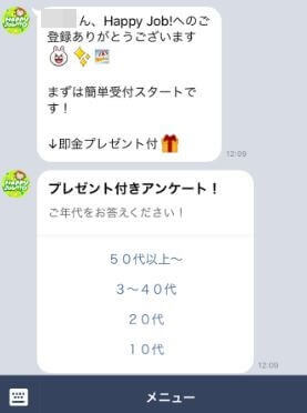 ということで、さっそくハッピージョブのLINEに登録してみましたが、まずはアンケートに答えるところからです。