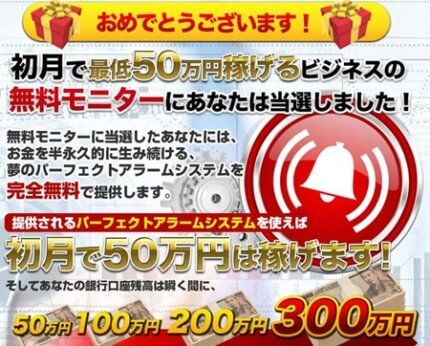 初月で50万円稼げて、そこから50万、100万、200万、300万と増え続けるという広告があって、メールアドレスの登録へ誘導されます。