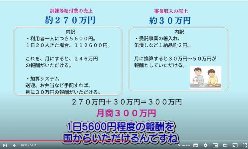 さらに利用者の軽作業での納品による報酬も月30万円程度計算でき、これらをざっくりと合わせると月300万円の売上が見込めますね。