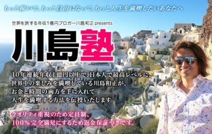 主な収入源は、ブログ、メルマガ、Facebookなどで、「川島塾」という自身のスクールも運営しています。
