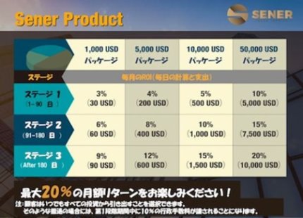 じゃあ「SENER」は実際にどのような内容だったかというと、アメリカにある投資会社「SENER」に投資すると「SENERドル」と呼ばれるものが受け取れ、最大月利20%の高配当を受け取れるというものでした。