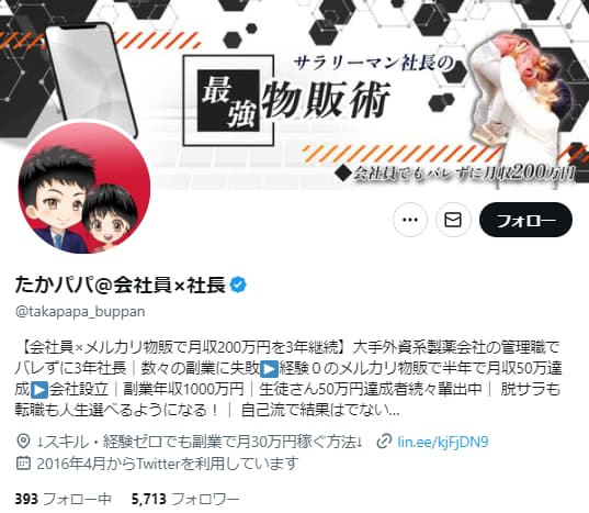 まず、たかパパさんは30代の男性で、現在は外資系企業の営業職をしながら、物販や物販コンサルをやっています。